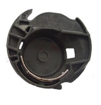 This bobbin case holds the threaded bobbin safely in the lower part of the sewing machine.