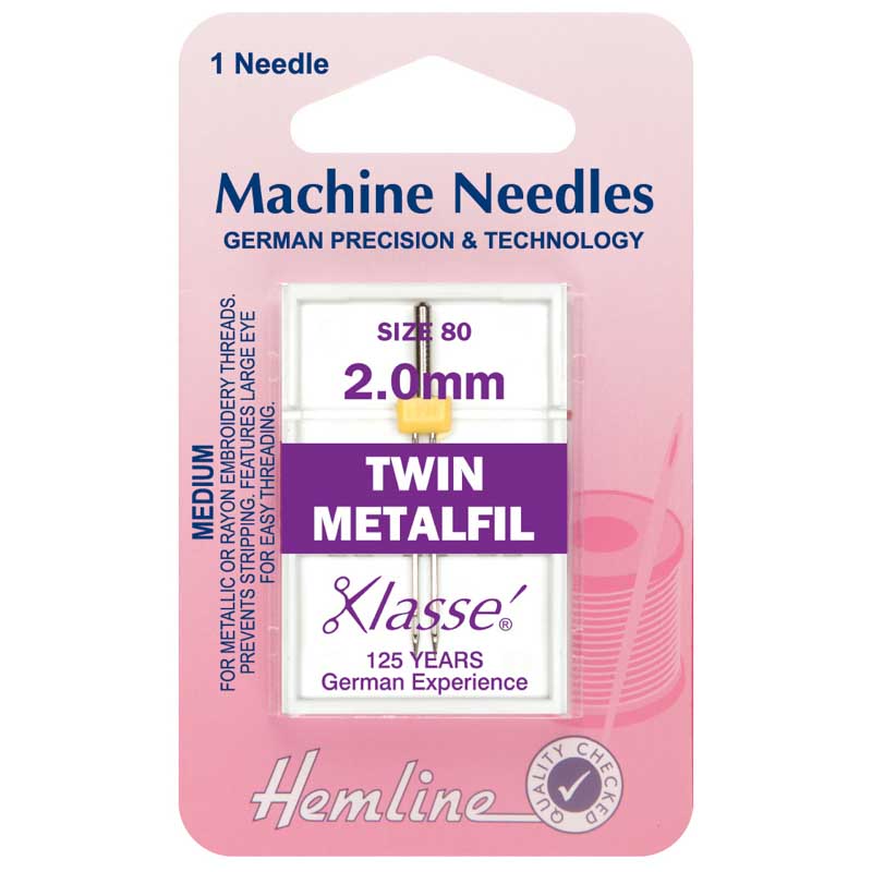 Twin needles are designed for practical and decorative sewing such as pin tucking, seam finishes, top stitching, etc. Metafil needles are for embroidery with metallic threads. Twin needles should be sewn at reduced speed. Size: 80 /12 – 2mm.