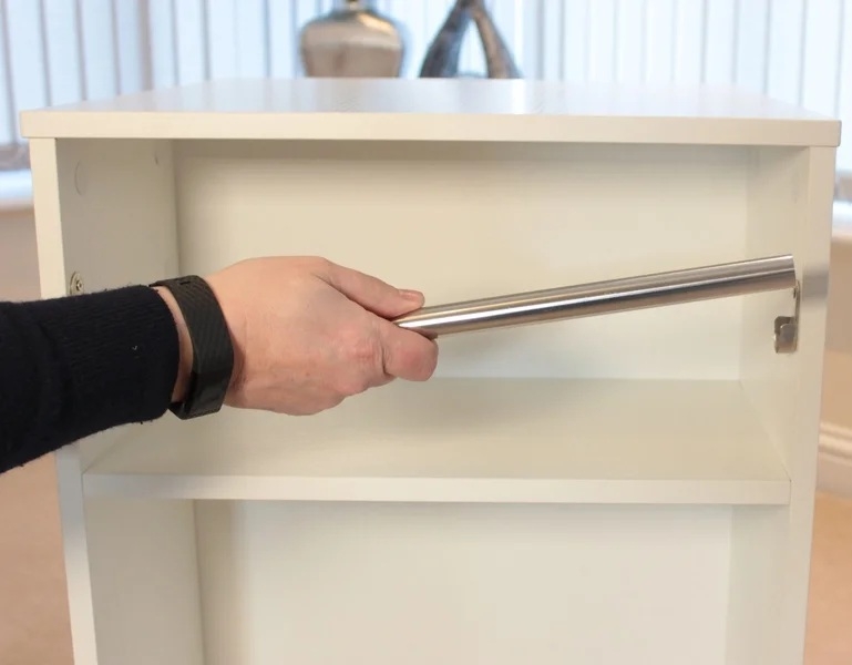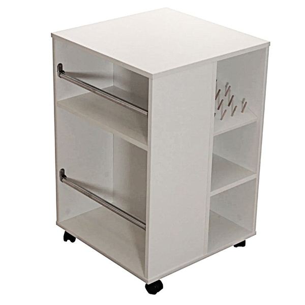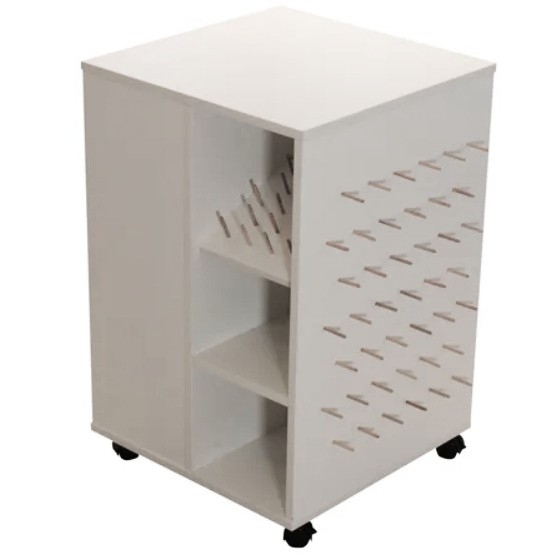 It features 18 thread spindles, 42 detachable thread and bobbin holders, rods for hanging ribbon with additional storage behind them, heavy-duty castors for effortless movement and adjustable shelves for storing fabric, books and other sewing supplies.