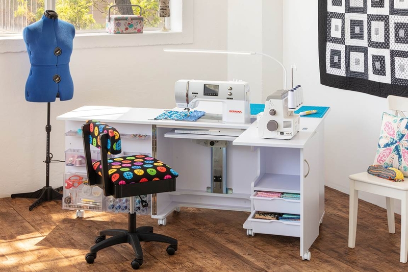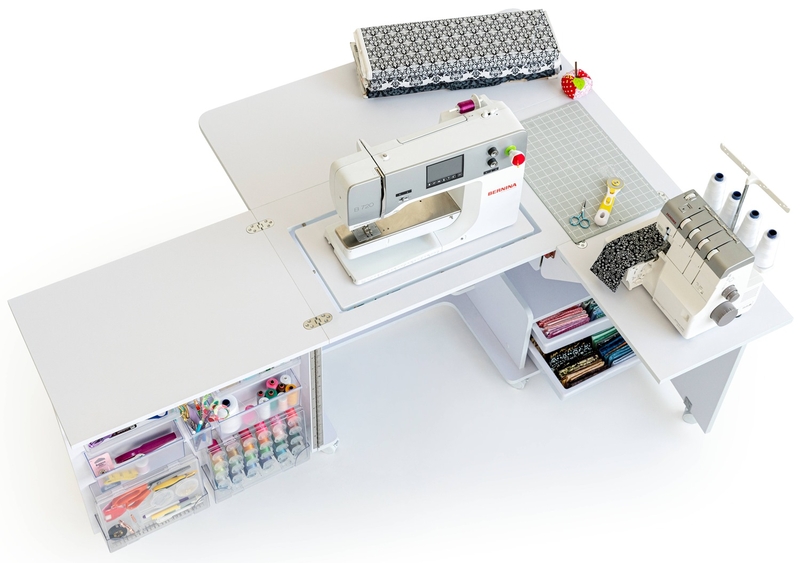 This Horn Nova XL model arrives fitted with our 3 step push down release air-lift mechanism which means a quick push down moves your machine from storage to flatbed to free-arm positions.