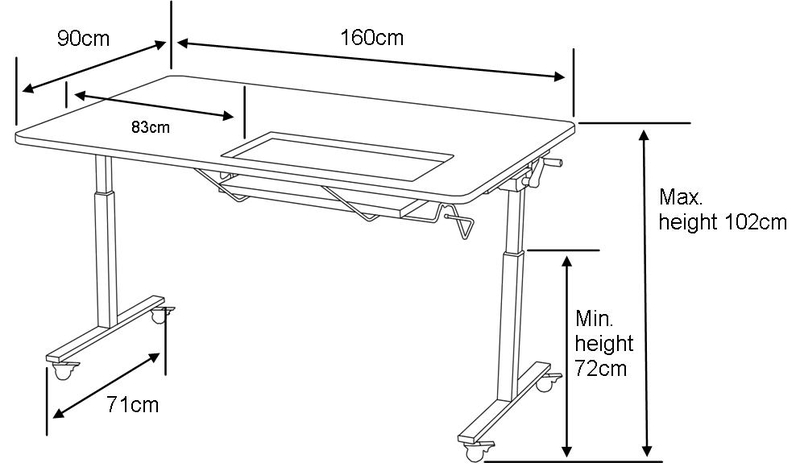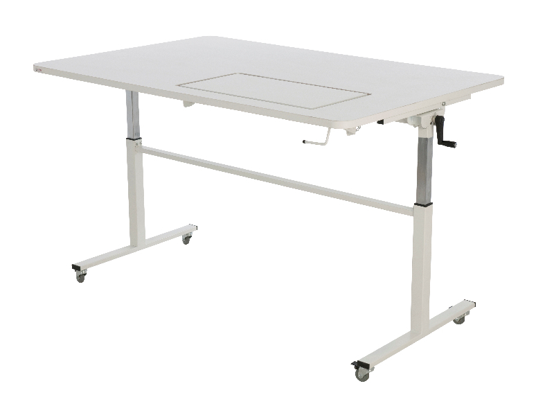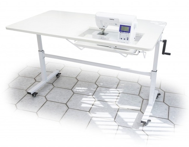 Clever platform mechanism that your sewing machine sits on which can either be dropped for flatbed use (using an inset) or raised for free-arm and embroidery arm use.