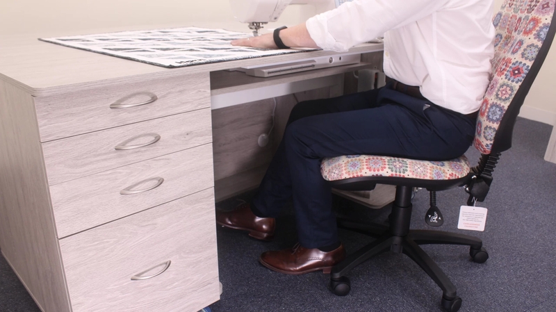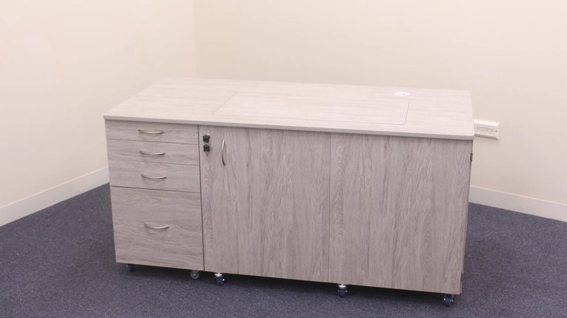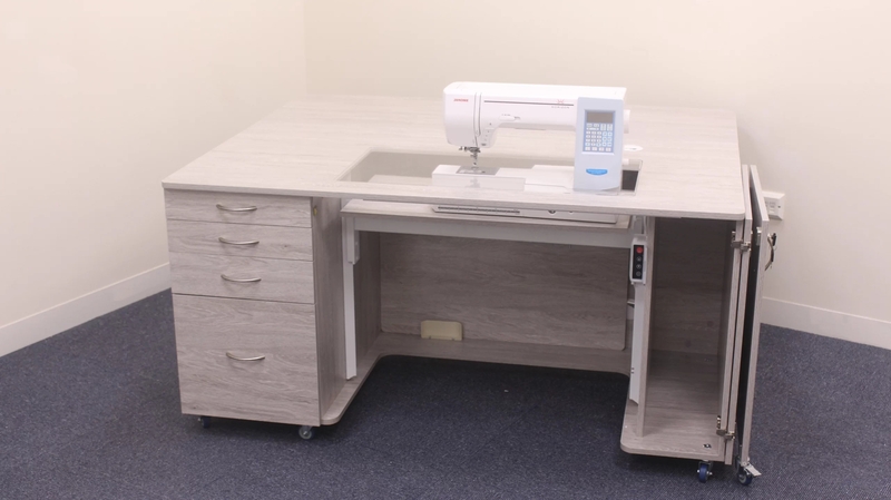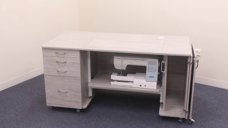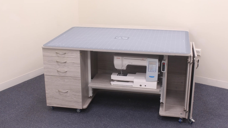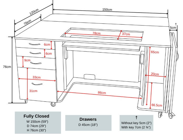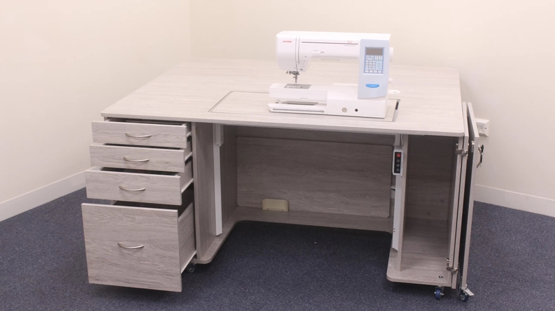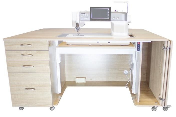 • Deep integrated drawers can store accessories, notions and fabric.