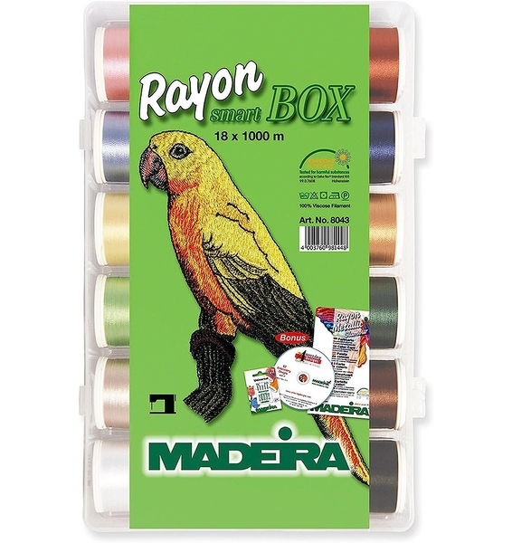 18 x 1,000m Rayon 40 spools. 1 x CD with 82 designs, 1 x Universal needles.