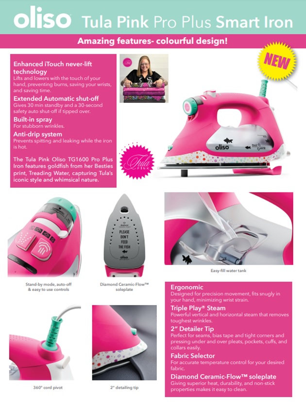 This collaboration blends Tula Pink's creativity with Oliso's precision and performance, resulting in a stylish and functional iron designed to enhance your quilting and sewing projects.